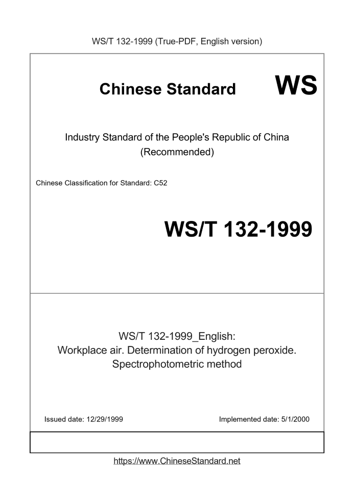 US$199.00 · In stock · Download in 9 secondsWS/T 132-1999: Workplace air. Determination of hydrogen peroxide. Spectrophotometric method