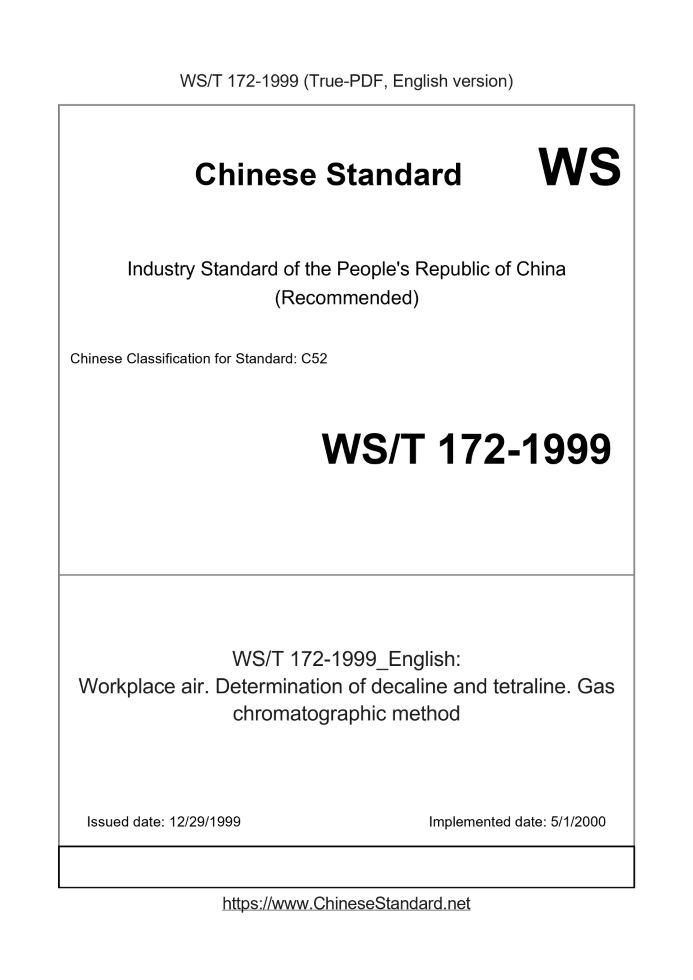 US$199.00 · In stock · Download in 9 secondsWS/T 172-1999: Workplace air. Determination of decaline and tetraline. Gas chromatographic method