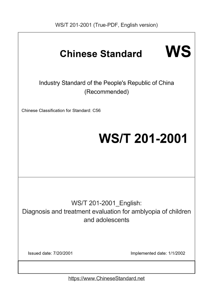 | WS/T 201-2001 | English | 239 | Add to Cart | 3 days [Need to translate] | Diagnosis and treatment evaluation for amblyopia of children and adolescents |