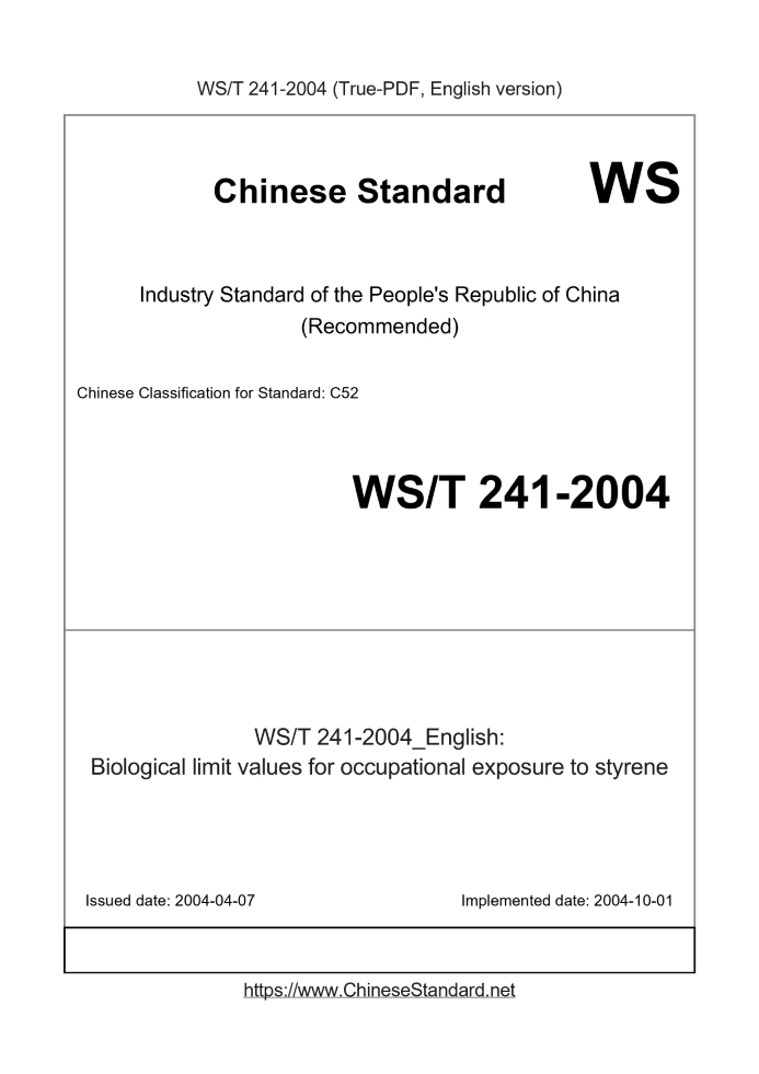 | WS/T 241-2004 | English | 229 | Add to Cart | 3 days [Need to translate] | Biological limit values for occupational exposure to styrene |