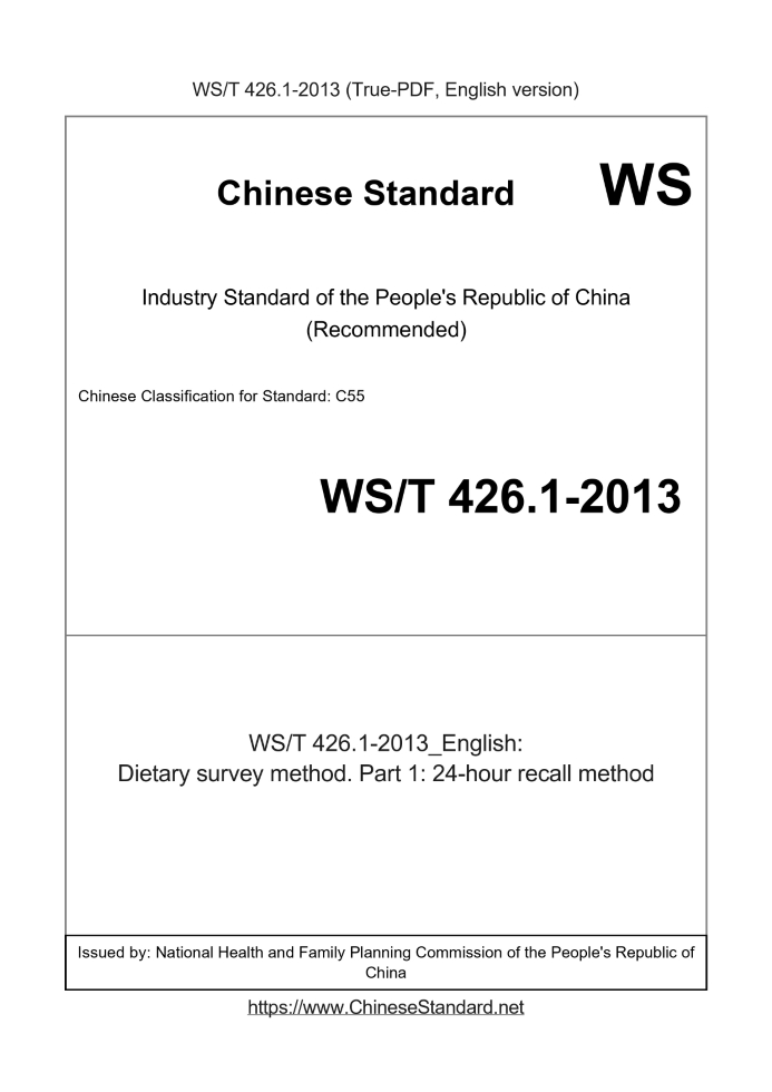 Delivery: <= 3 days. True-PDF full-copy in English will be manually translated and delivered via email. WS/T 426.1-2013: Dietary survey method. Part 1: 24-hour recall method Status: Valid