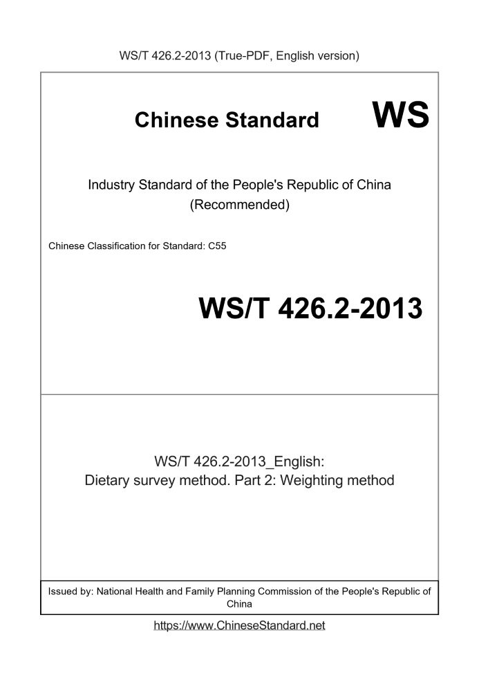 Delivery: <= 3 days. True-PDF full-copy in English will be manually translated and delivered via email. WS/T 426.2-2013: Dietary survey method. Part 2: Weighting method Status: Valid
