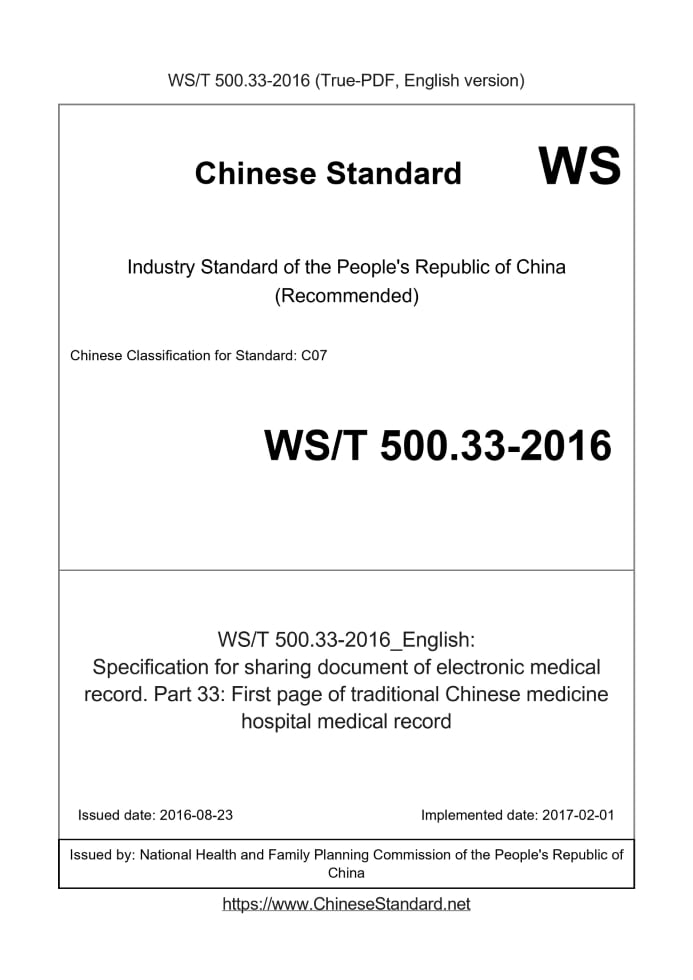 Delivery: <= 13 days. True-PDF full-copy in English will be manually translated and delivered via email. WS/T 500.33-2016: Specification for sharing document of electronic medical record. Part 33: First page of traditional Chinese medicine hospital medical record Status: Valid