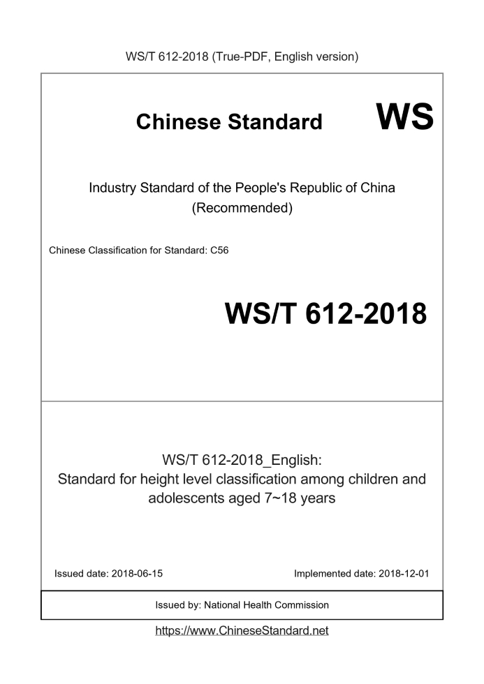 US$149.00 · In stock · Download in 9 secondsWS/T 612-2018: Standard for height level classification among children and adolescents aged 7~18 years