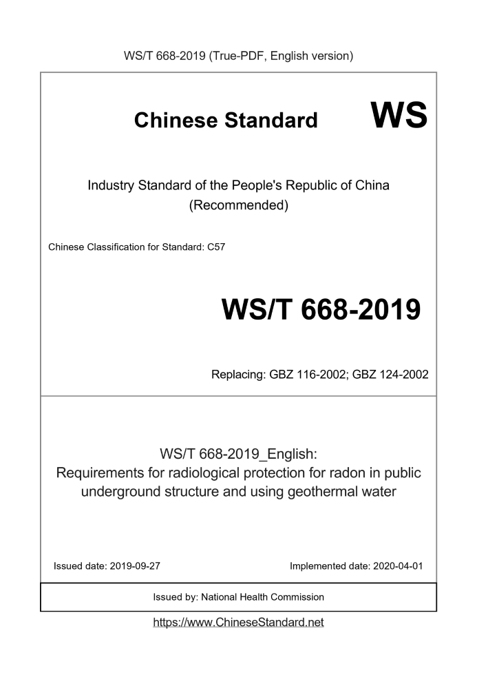 WS/T 668-2019: Requirements for radiological protection for radon in public underground structure and using geothermal water