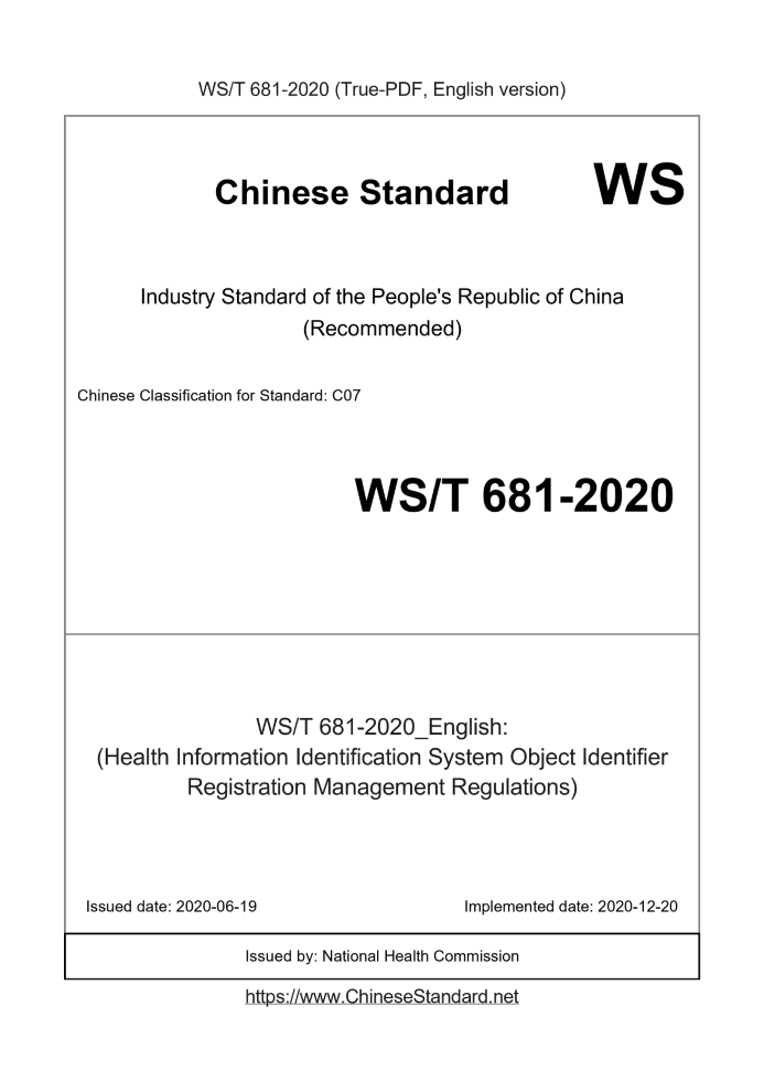 Delivery: <= 5 days. True-PDF full-copy in English will be manually translated and delivered via email. WS/T 681-2020: (Health Information Identification System Object Identifier Registration Management Regulations) Status: Valid