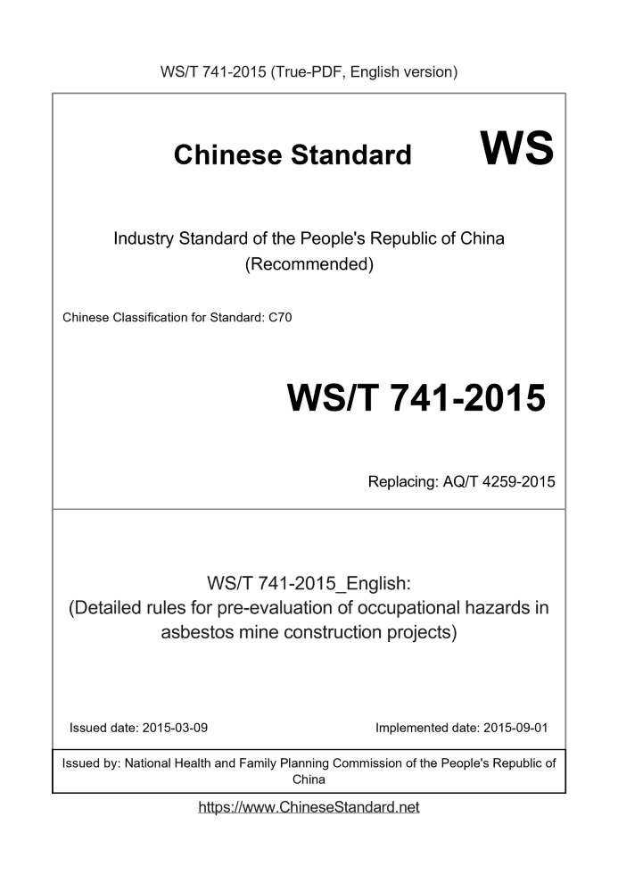 Delivery: <= 3 days. True-PDF full-copy in English will be manually translated and delivered via email. WS/T 741-2015: (Detailed rules for pre-evaluation of occupational hazards in asbestos mine construction projects) Status: Valid