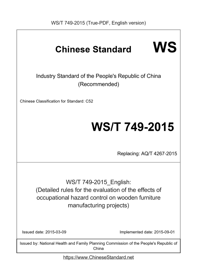 Delivery: <= 4 days. True-PDF full-copy in English will be manually translated and delivered via email. WS/T 749-2015: (Detailed rules for the evaluation of the effects of occupational hazard control on wooden furniture manufacturing projects) Status: Valid