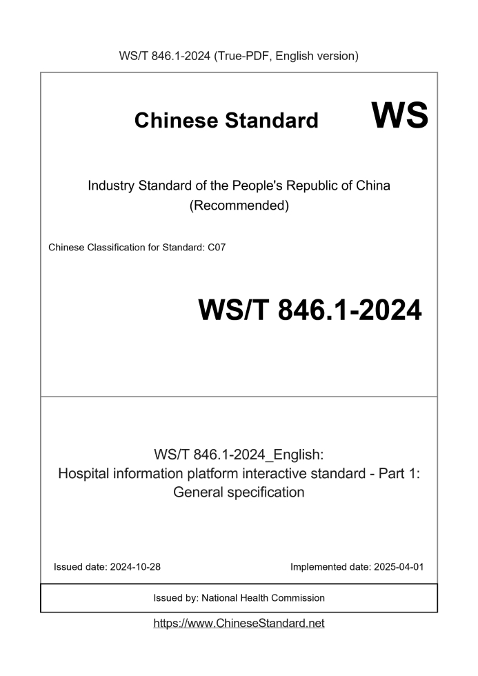 Delivery: <= 3 days. True-PDF full-copy in English will be manually translated and delivered via email. WS/T 846.1-2024: Hospital information platform interactive standard - Part 1: General specification Status: Valid