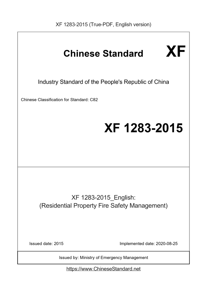 Delivery: <= 3 days. True-PDF full-copy in English will be manually translated and delivered via email. XF1283-2015: (Residential Property Fire Safety Management) Status: Valid