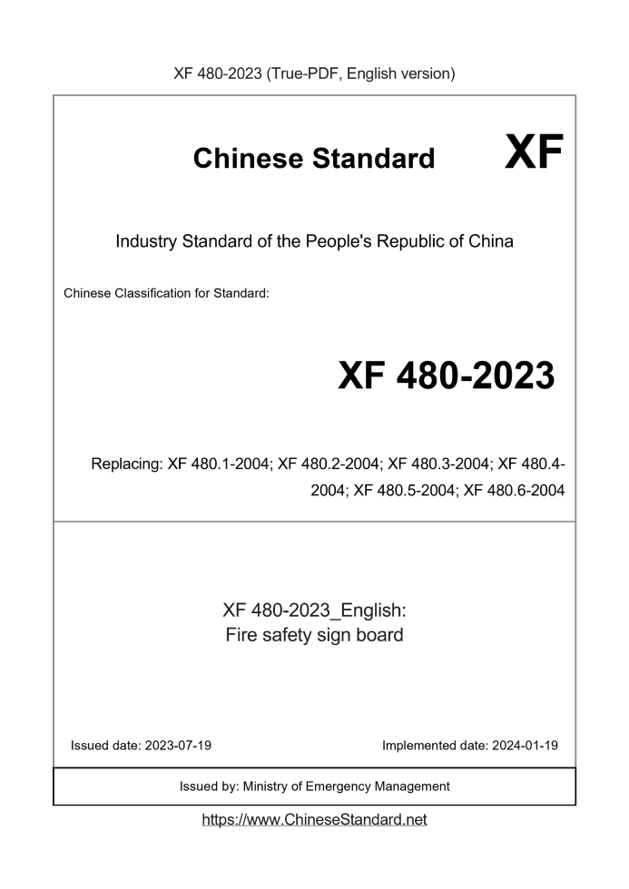Basic dataStandard ID: XF 480-2023 (XF480-2023)Description (Translated English): Fire safety sign board Sector / Industry: Chinese Industry Standard Classification of International Standard: C84 Word Count Estimation: 18,197 Date of Issue: 2023-07-19 Date of Implementation: 2024-01-19 Older Standard (superseded by this standard): XF 480.1-2004; XF 480.2-2004; XF 480.3-2004; XF 480.4-2004; XF 480.5-2004; XF 480.6-2004 Issuing agency(ies): Ministry of Emergency Management Summary: This standard specifies the models and codes of fire safety signs, technical requirements, inspection rules, marking, packaging, transportation and storage, defines terms and definitions, and describes test methods. This standard applies to all types of fire safety signs that convey fire safety information to the public. Tips & Frequently Asked Questions:Question 1: How long will the true-PDF of XF480-2023_English be delivered?Answer: Upon your order, we will start to translate XF480-2023_English as soon as possible, and keep you informed of the progress. The lead time is typically 2 ~ 4 working days. The lengthier the document the longer the lead time.Question 2: Can I share the purchased PDF of XF480-2023_English with my colleagues?Answer: Yes. The purchased PDF of XF480-2023_English will be deemed to be sold to your employer/organization who actually pays for it, including your colleagues and your employer's intranet.Question 3: Does the price include tax/VAT?Answer: Yes. Our tax invoice, downloaded/delivered in 9 seconds, includes all tax/VAT and complies with 100+ countries' tax regulations (tax exempted in 100+ countries) -- See Avoidance of Double Taxation Agreements (DTAs): List of DTAs signed between Singapore and 100+ countriesQuestion 4: Do you accept my currency other than USD?Answer: Yes. If you need your currency to be printed on the invoice, please write an email to Sales@ChineseStandard.net. In 2 working-hours, we will create a special link for you to pay in any currencies. Otherwise, follow the normal steps: Add to Cart -- Checkout -- Select your currency to pay. |