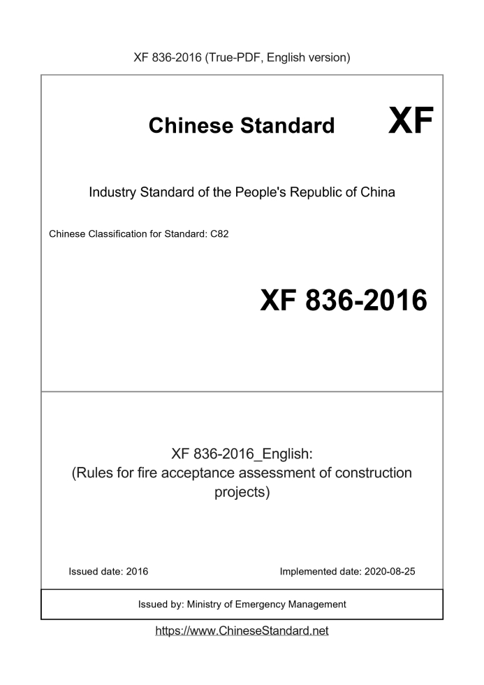 Delivery: <= 5 days. True-PDF full-copy in English will be manually translated and delivered via email. XF836-2016: (Rules for fire acceptance assessment of construction projects) Status: Valid