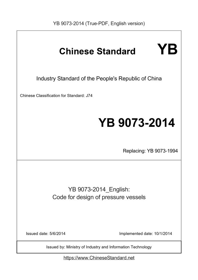 Delivery: <= 13 days. True-PDF full-copy in English will be manually translated and delivered via email. YB 9073-2014: Code for design of pressure vessels Status: Valid YB 9073: Historical versions