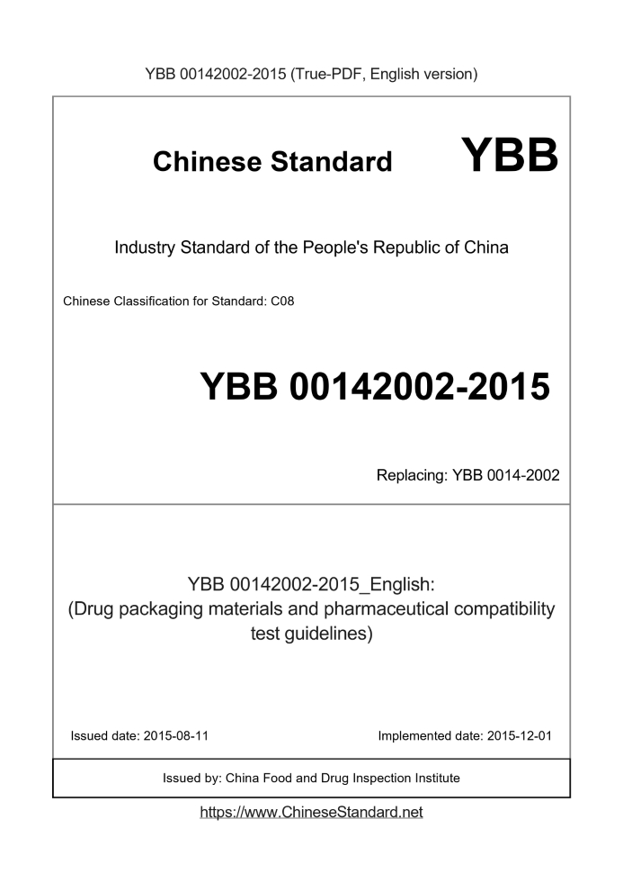 Delivery: <= 2 days. True-PDF full-copy in English will be manually translated and delivered via email. YBB 00142002-2015: (Drug packaging materials and pharmaceutical compatibility test guidelines) Status: Valid