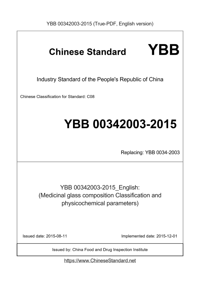 Delivery: <= 2 days. True-PDF full-copy in English will be manually translated and delivered via email. YBB 00342003-2015: (Medicinal glass composition Classification and physicochemical parameters) Status: Valid