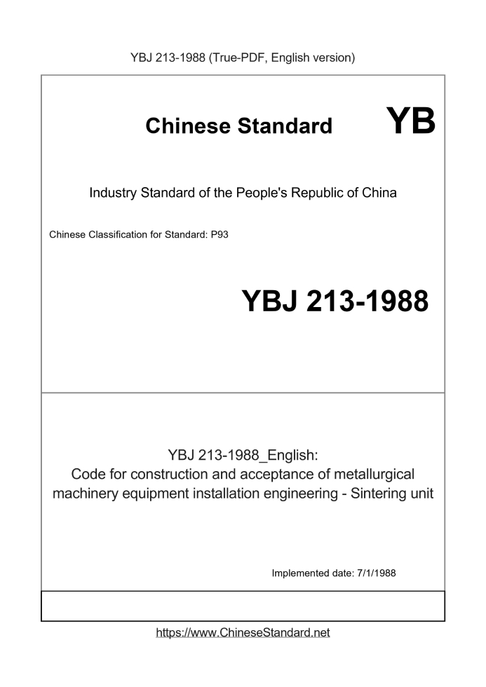 Delivery: <= 5 days. True-PDF full-copy in English will be manually translated and delivered via email. YBJ213-1988: Code for construction and acceptance of metallurgical machinery equipment installation engineering - Sintering unit