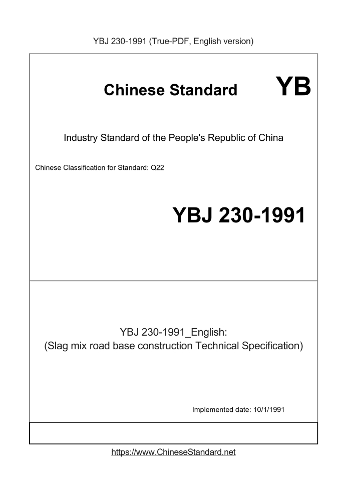 Delivery: <= 6 days. True-PDF full-copy in English will be manually translated and delivered via email. YBJ230-1991: (Slag mix road base construction Technical Specification) Status: Obsolete