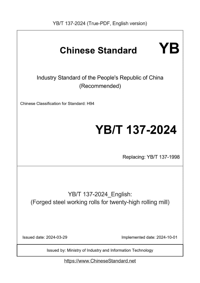 Delivery: <= 3 days. True-PDF full-copy in English will be manually translated and delivered via email. YB/T 137-2024: (Forged steel working rolls for twenty-high rolling mill) Status: Valid YB/T 137: Historical versions