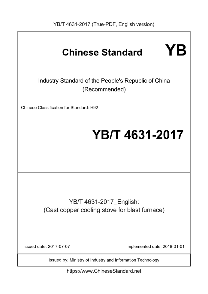 Delivery: <= 3 days. True-PDF full-copy in English will be manually translated and delivered via email. YB/T 4631-2017: (Cast copper cooling stove for blast furnace) Status: Valid