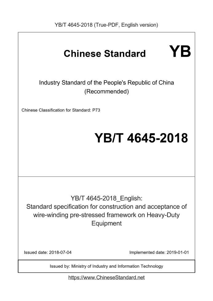 Delivery: <= 6 days. True-PDF full-copy in English will be manually translated and delivered via email. YB/T 4645-2018: Standard specification for construction and acceptance of wire-winding pre-stressed framework on Heavy-Duty Equipment Status: Valid