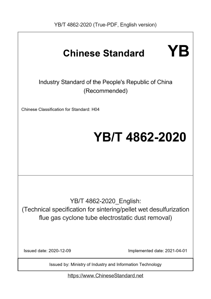 Delivery: <= 3 days. True-PDF full-copy in English will be manually translated and delivered via email. YB/T 4862-2020: (Technical specification for sintering/pellet wet desulfurization flue gas cyclone tube electrostatic dust removal) Status: Valid