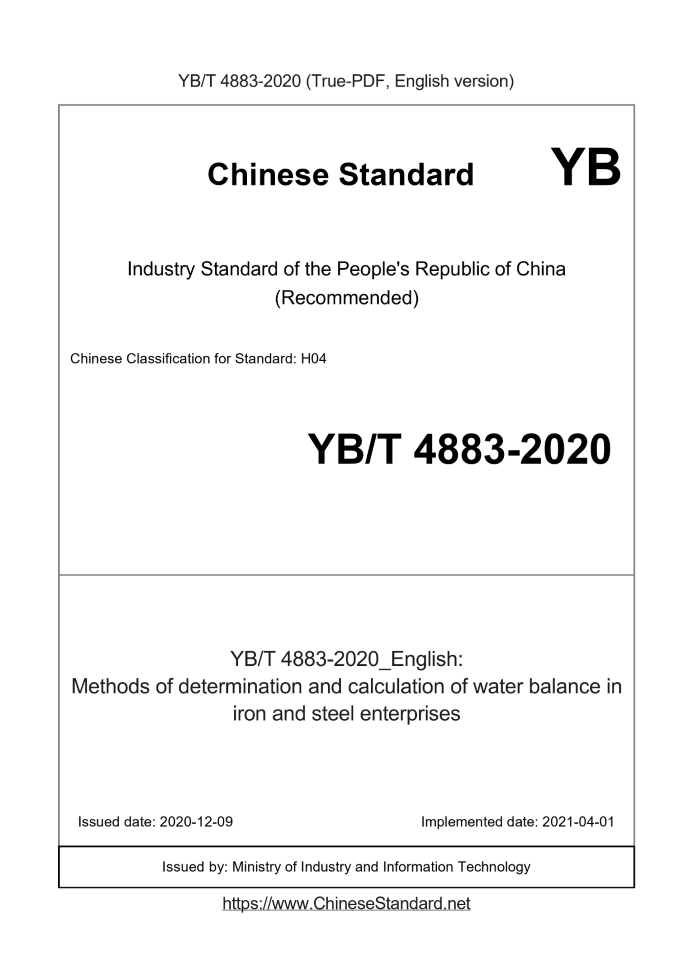 Delivery: <= 3 days. True-PDF full-copy in English will be manually translated and delivered via email. YB/T 4883-2020: Methods of determination and calculation of water balance in iron and steel enterprises Status: Valid
