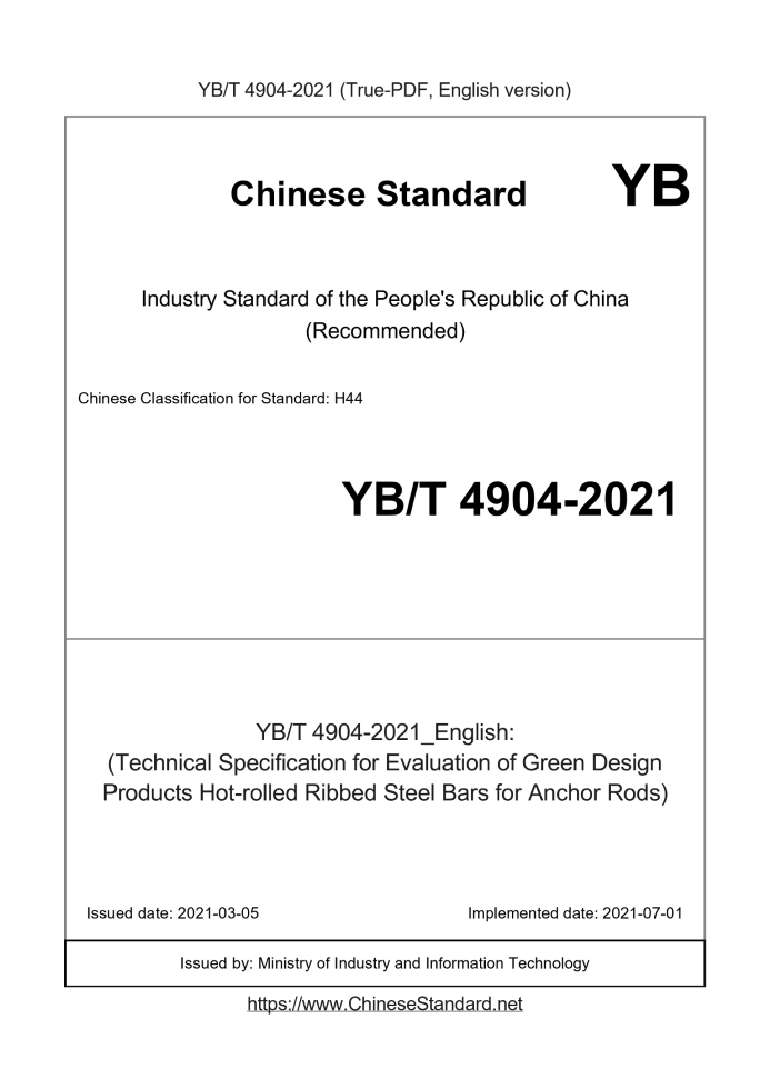 Delivery: <= 4 days. True-PDF full-copy in English will be manually translated and delivered via email. YB/T 4904-2021: (Technical Specification for Evaluation of Green Design Products Hot-rolled Ribbed Steel Bars for Anchor Rods) Status: Valid