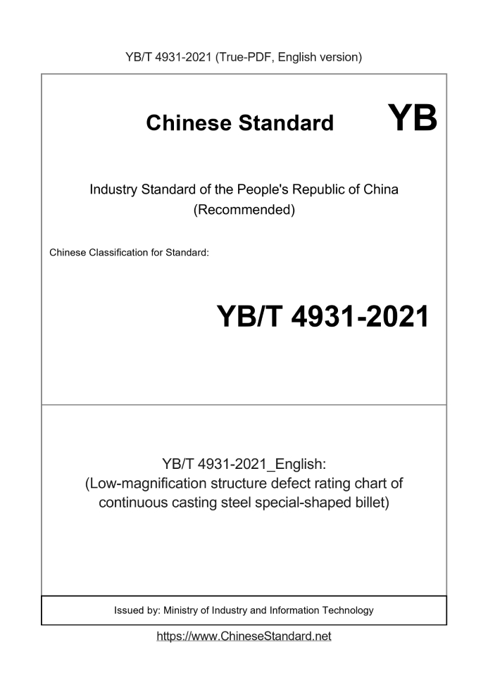 Delivery: <= 8 days. True-PDF full-copy in English will be manually translated and delivered via email. YB/T 4931-2021: (Low-magnification structure defect rating chart of continuous casting steel special-shaped billet) Status: Valid