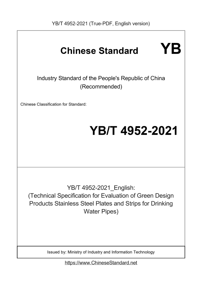 Delivery: <= 4 days. True-PDF full-copy in English will be manually translated and delivered via email. YB/T 4952-2021: (Technical Specification for Evaluation of Green Design Products Stainless Steel Plates and Strips for Drinking Water Pipes) Status: Valid
