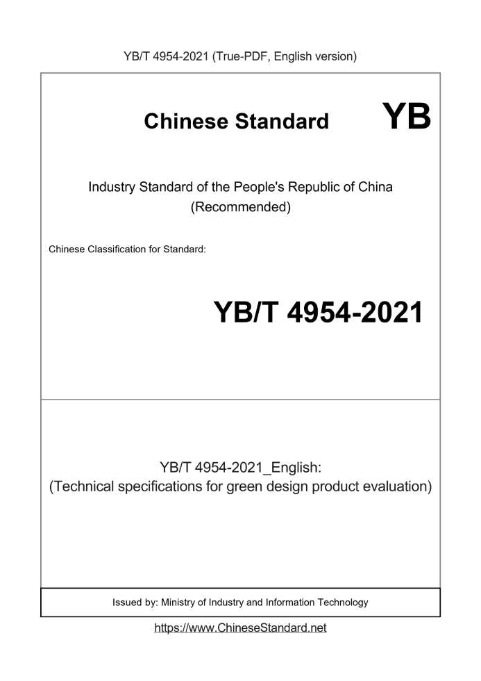 Delivery: <= 4 days. True-PDF full-copy in English will be manually translated and delivered via email. YB/T 4954-2021: (Technical specifications for green design product evaluation) Status: Valid