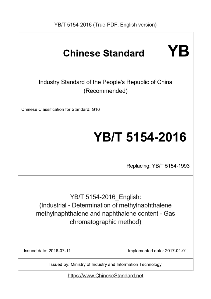 Delivery: <= 3 days. True-PDF full-copy in English will be manually translated and delivered via email. YB/T 5154-2016: (Industrial - Determination of methylnaphthalene methylnaphthalene and naphthalene content - Gas chromatographic method) Status: Valid YB/T 5154: Historical versions