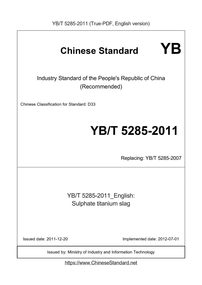 Delivery: <= 3 days. True-PDF full-copy in English will be manually translated and delivered via email. YB/T 5285-2011: Sulphate titanium slag Status: Valid YB/T 5285: Historical versions