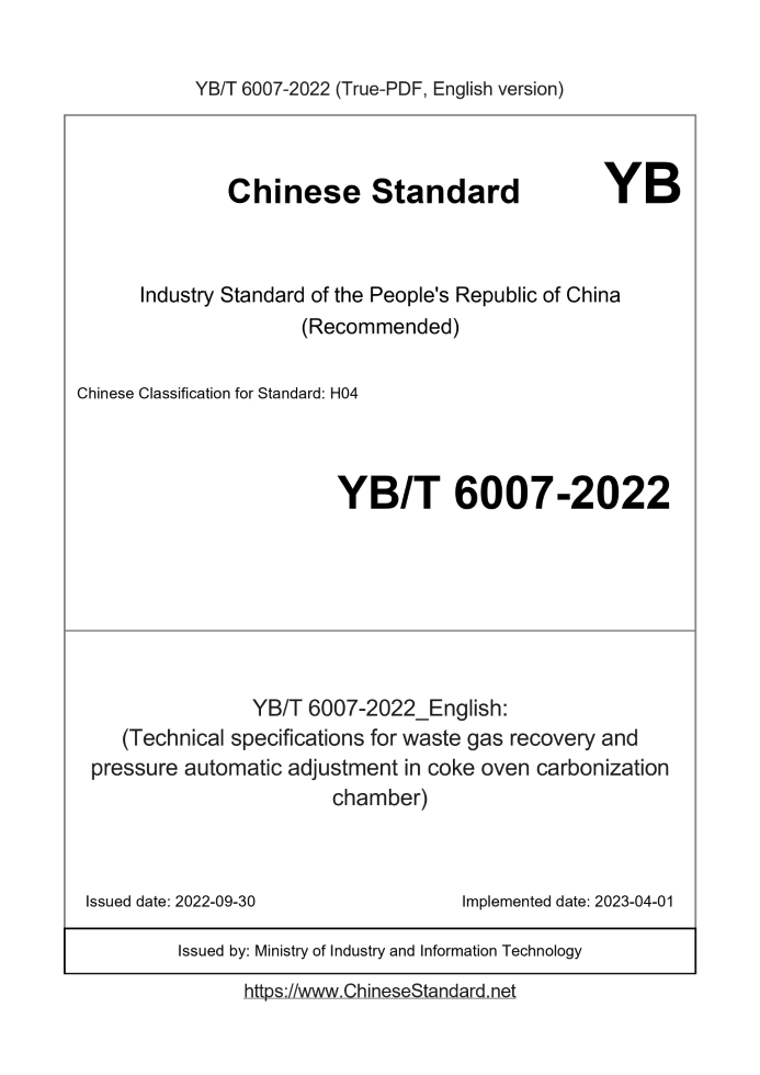 Basic dataStandard ID: YB/T 6007-2022 (YB/T6007-2022)Description (Translated English): (Technical specifications for waste gas recovery and pressure automatic adjustment in coke oven carbonization chamber) Sector / Industry: Ferrous Metallurgy Industry Standard (Recommended) Classification of Chinese Standard: H04 Classification of International Standard: 77.010 Date of Issue: 2022-09-30 Date of Implementation: 2023-04-01 Issuing agency(ies): Ministry of Industry and Information Technology Summary: This standard specifies the terms and definitions, principles and processes, technical requirements, operation requirements, and maintenance requirements for coke oven carbonization chamber waste gas recovery and automatic pressure adjustment technology. This standard applies to top-loading coke ovens and tamped coke ovens. |