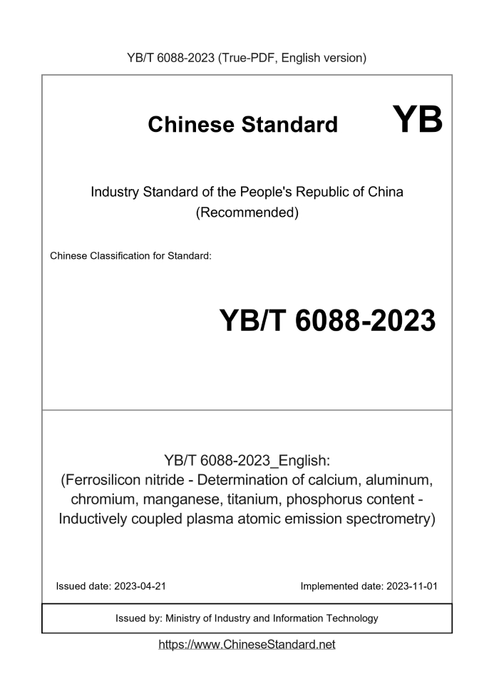 Delivery: <= 3 days. True-PDF full-copy in English will be manually translated and delivered via email. YB/T 6088-2023: (Ferrosilicon nitride - Determination of calcium, aluminum, chromium, manganese, titanium, phosphorus content - Inductively coupled plasma atomic emission spectrometry) Status: Valid
