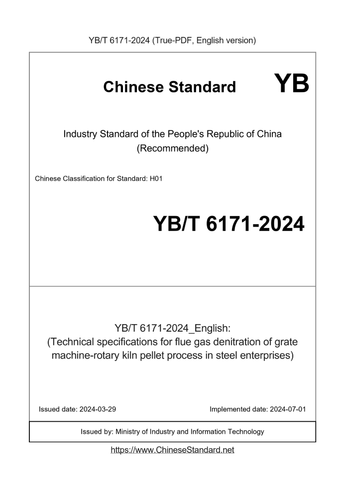 Delivery: <= 3 days. True-PDF full-copy in English will be manually translated and delivered via email. YB/T 6171-2024: (Technical specifications for flue gas denitration of grate machine-rotary kiln pellet process in steel enterprises) Status: Valid