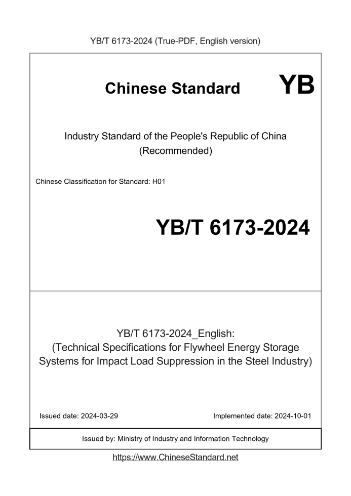 Delivery: <= 4 days. True-PDF full-copy in English will be manually translated and delivered via email. YB/T 6173-2024: (Technical Specifications for Flywheel Energy Storage Systems for Impact Load Suppression in the Steel Industry) Status: Valid