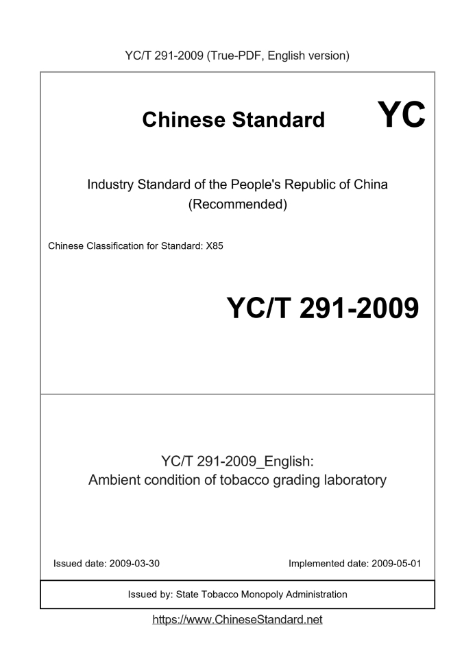 Delivery: <= 3 days. True-PDF full-copy in English will be manually translated and delivered via email. YC/T 291-2009: Ambient condition of tobacco grading laboratory Status: Valid