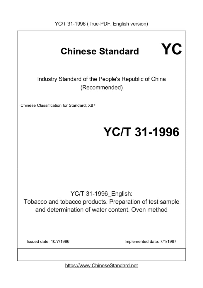 Delivery: <= 2 days. True-PDF full-copy in English will be manually translated and delivered via email. YC/T 31-1996: Tobacco and tobacco products. Preparation of test sample and determination of water content. Oven method