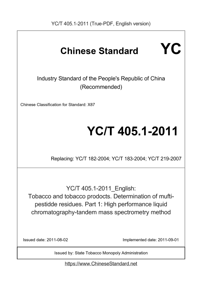 Delivery: <= 3 days. True-PDF full-copy in English will be manually translated and delivered via email. YC/T 405.1-2011: Tobacco and tobacco prodocts. Determination of mufti-pestidde residues. Part 1: High performance liquid chromatography-tandem mass spectrometry method Status: Valid