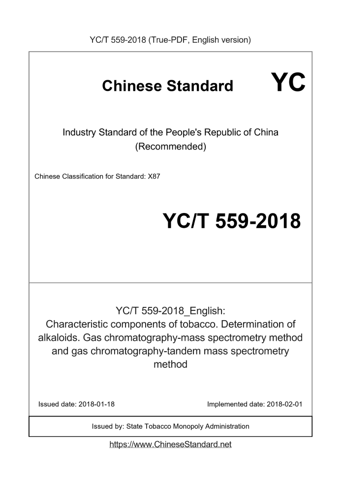 Delivery: <= 4 days. True-PDF full-copy in English will be manually translated and delivered via email. YC/T 559-2018: Characteristic components of tobacco. Determination of alkaloids. Gas chromatography-mass spectrometry method and gas chromatography-tandem mass spectrometry method Status: Valid