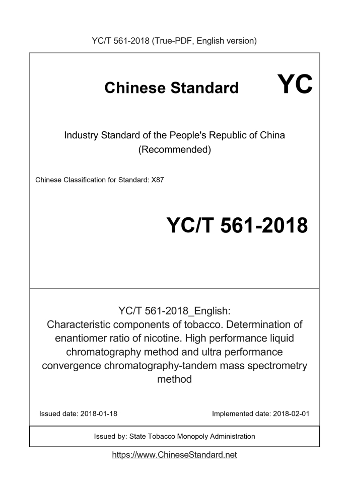Delivery: <= 3 days. True-PDF full-copy in English will be manually translated and delivered via email. YC/T 561-2018: Characteristic components of tobacco. Determination of enantiomer ratio of nicotine. High performance liquid chromatography method and ultra performance convergence chromatography-tandem mass spectrometry method Status: Valid