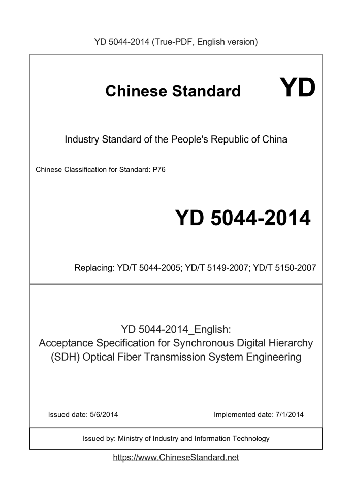 Delivery: <= 8 days. True-PDF full-copy in English will be manually translated and delivered via email. YD 5044-2014: Acceptance Specification for Synchronous Digital Hierarchy (SDH) Optical Fiber Transmission System Engineering Status: Valid YD 5044: Historical versions