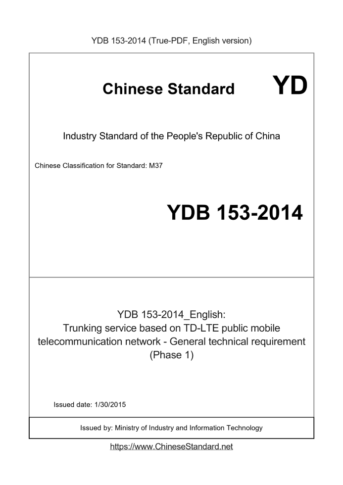 Delivery: <= 3 days. True-PDF full-copy in English will be manually translated and delivered via email. YDB153-2014: Trunking service based on TD-LTE public mobile telecommunication network - General technical requirement (Phase 1) Status: Valid
