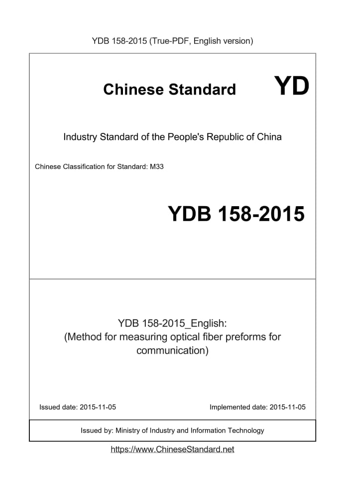 Delivery: <= 4 days. True-PDF full-copy in English will be manually translated and delivered via email. YDB158-2015: (Method for measuring optical fiber preforms for communication) Status: Valid