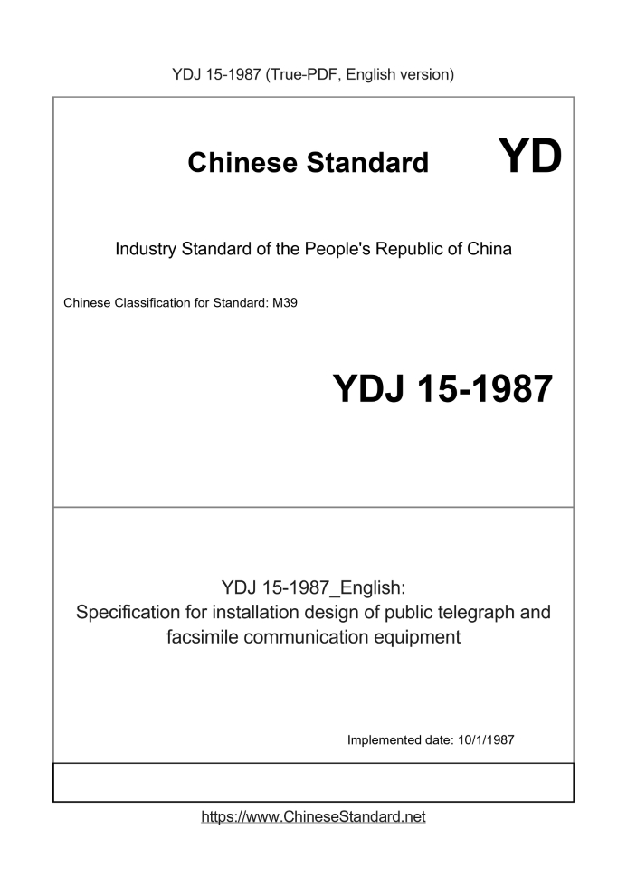 Delivery: <= 5 days. True-PDF full-copy in English will be manually translated and delivered via email. YDJ15-1987: Specification for installation design of public telegraph and facsimile communication equipment