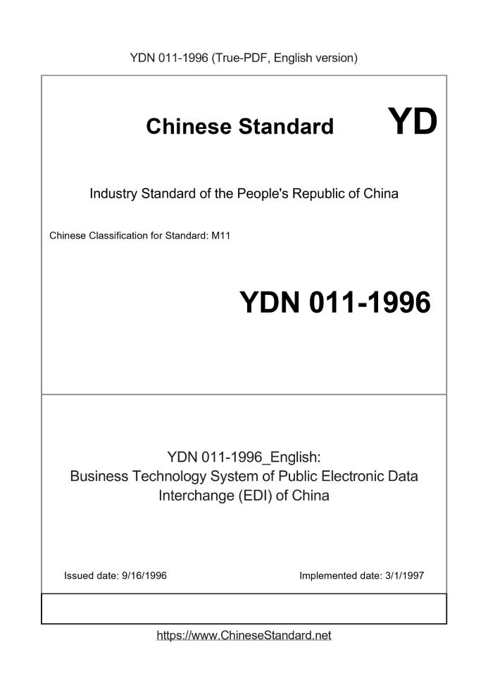 Basic dataStandard ID: YDN 011-1996 (YDN011-1996)Description (Translated English): Business Technology System of Public Electronic Data Interchange (EDI) of China Sector / Industry: Telecommunication Industry Standard Classification of Chinese Standard: M11 Word Count Estimation: 165,179 Date of Issue: 9/16/1996 Date of Implementation: 3/1/1997 Regulation (derived from): Notice of the Ministry of Industry and Information Technology of the People's Republic of China (No. 48 of 2015) Tips & Frequently Asked Questions:Question 1: How long will the true-PDF of YDN011-1996_English be delivered?Answer: Upon your order, we will start to translate YDN011-1996_English as soon as possible, and keep you informed of the progress. The lead time is typically 1 ~ 3 working days. The lengthier the document the longer the lead time.Question 2: Can I share the purchased PDF of YDN011-1996_English with my colleagues?Answer: Yes. The purchased PDF of YDN011-1996_English will be deemed to be sold to your employer/organization who actually pays for it, including your colleagues and your employer's intranet.Question 3: Does the price include tax/VAT?Answer: Yes. Our tax invoice, downloaded/delivered in 9 seconds, includes all tax/VAT and complies with 100+ countries' tax regulations (tax exempted in 100+ countries) -- See Avoidance of Double Taxation Agreements (DTAs): List of DTAs signed between Singapore and 100+ countriesQuestion 4: Do you accept my currency other than USD?Answer: Yes. If you need your currency to be printed on the invoice, please write an email to Sales@ChineseStandard.net. In 2 working-hours, we will create a special link for you to pay in any currencies. Otherwise, follow the normal steps: Add to Cart -- Checkout -- Select your currency to pay. |