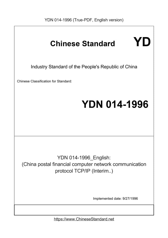 Delivery: <= 5 days. True-PDF full-copy in English will be manually translated and delivered via email. YDN014-1996: (China postal financial computer network communication protocol TCP/IP (Interim..) Status: Obsolete