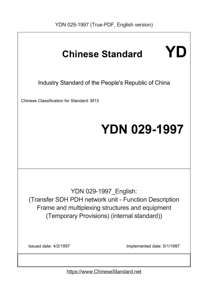 Delivery: <= 6 days. True-PDF full-copy in English will be manually translated and delivered via email. YDN029-1997: (Transfer SDH PDH network unit - Function Description Frame and multiplexing structures and equipment (Temporary Provisions) (internal standard)) Status: Obsolete