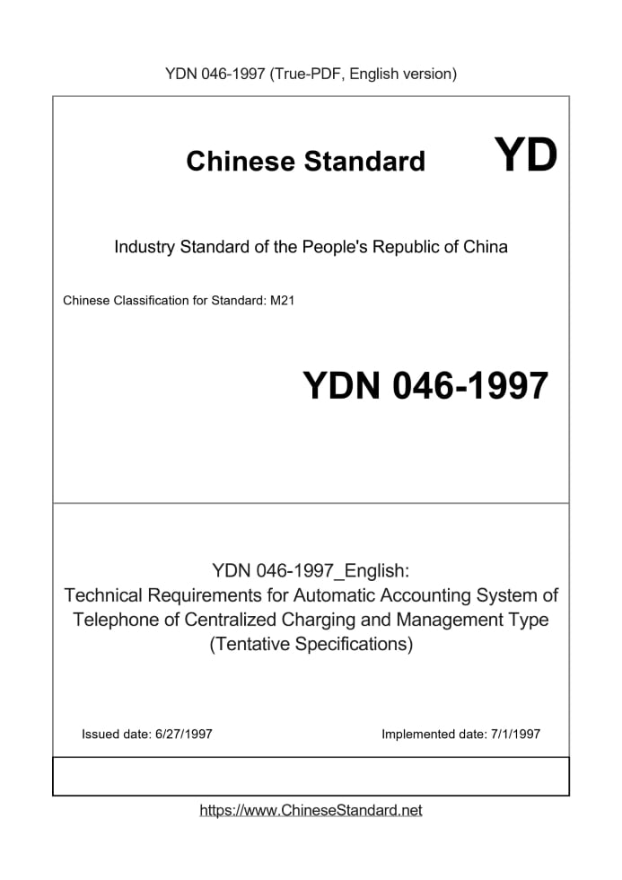 Delivery: <= 3 days. True-PDF full-copy in English will be manually translated and delivered via email. YDN046-1997: Technical Requirements for Automatic Accounting System of Telephone of Centralized Charging and Management Type (Tentative Specifications)