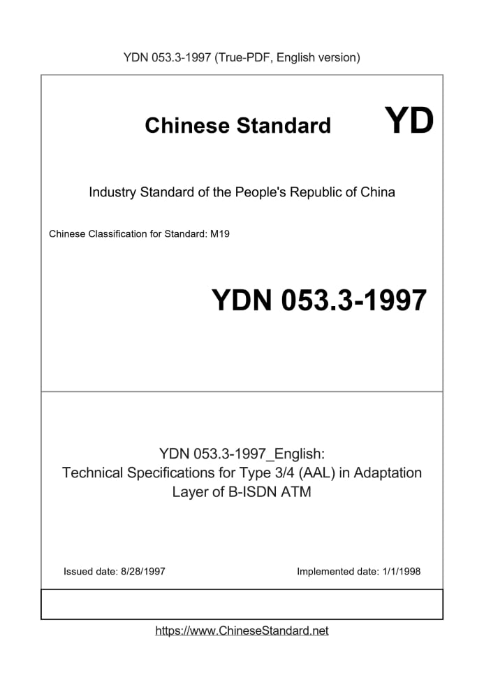 Delivery: <= 8 days. True-PDF full-copy in English will be manually translated and delivered via email. YDN053.3-1997: Technical Specifications for Type 3/4 (AAL) in Adaptation Layer of B-ISDN ATM